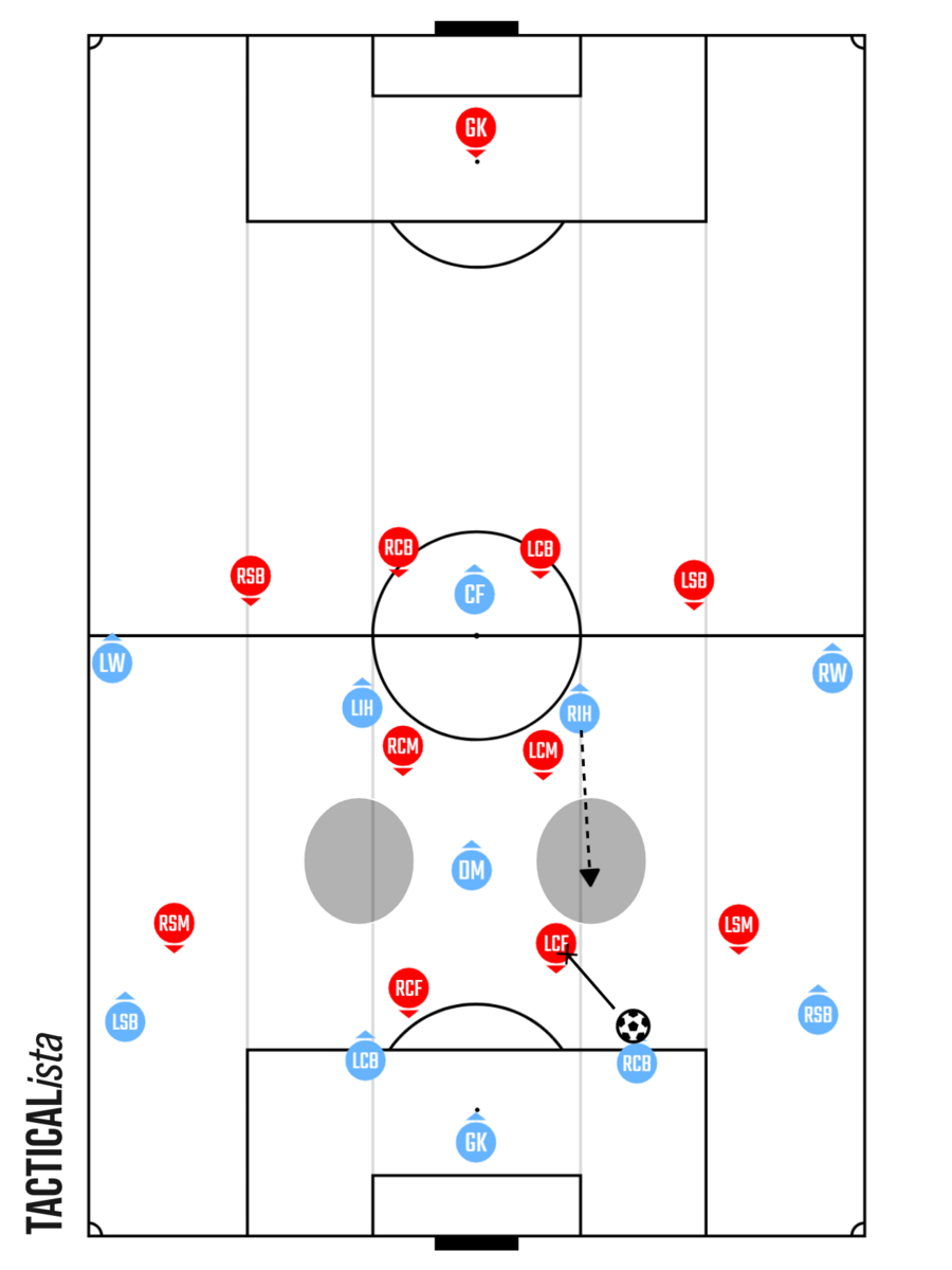 SBを背中で消しながらSHが当たる。アンカー2枚はシティのIHにマンマーク。シティのSBを意図的にフリーにしている。