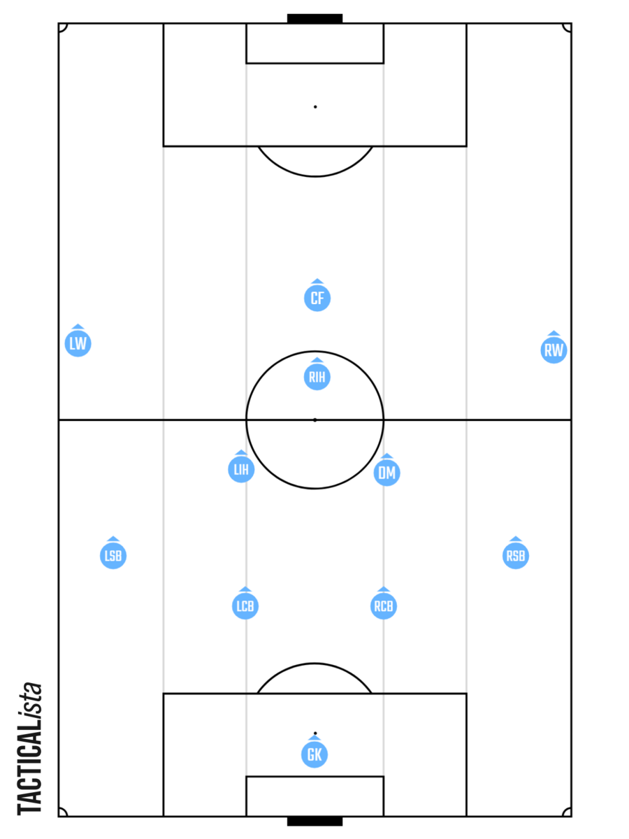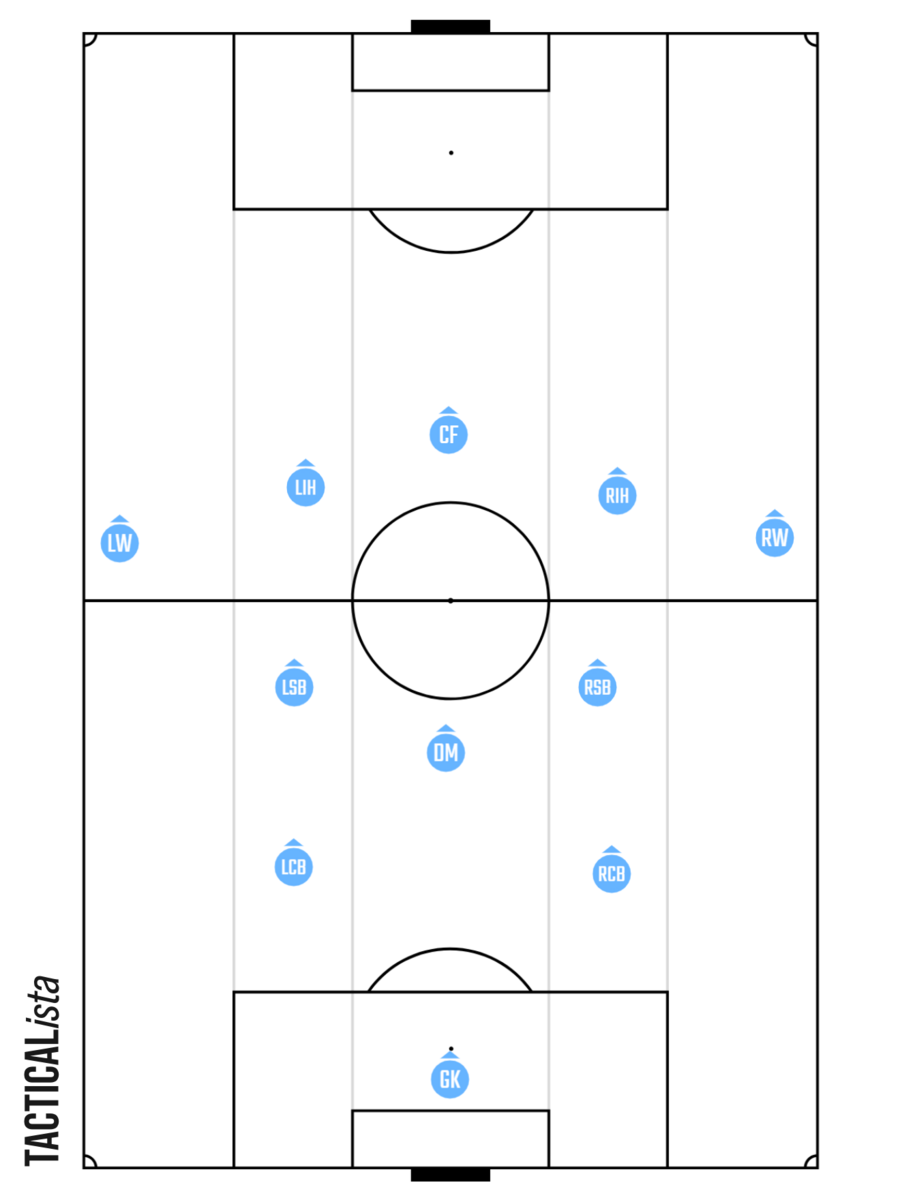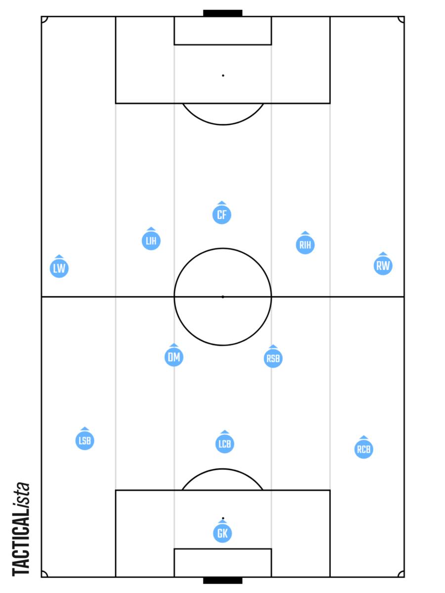 この時期の特徴は3-1、3-2のビルドアップ(相手によってフラットな4枚や可変なしの3-2のビルドアップを使用したりしている)で、後ろの3枚が大きくペナルティエリアの幅以上に開いていたこと。基本的には右からアカンジ、ディアス、アケという並び。